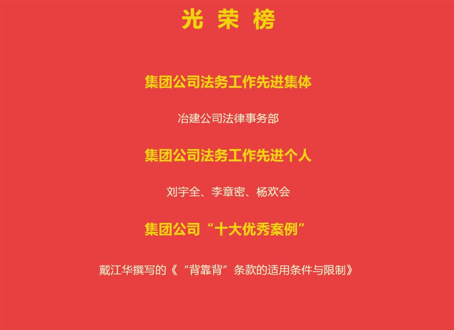 這些榮譽的取得,是全體法務(wù)人員辛勤努力的結(jié)果,更是公司整體實力的體現(xiàn)。冶建公司法律事務(wù)部將繼續(xù)為公司平穩(wěn)發(fā)展拼搏奮進,努力為公司實現(xiàn)恢復(fù)性增長作出新的貢獻!